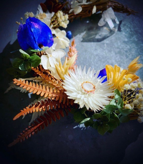 Vinewood moon decorated with dried and stabilized natural flowers, adorned with a point of raw rock crystal. Diameter : about 7,5 inches.